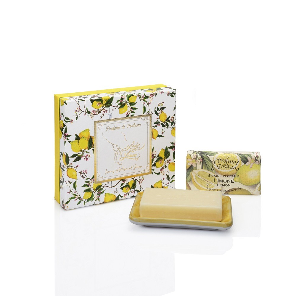 Set 2 saponi con portasapone in ceramica - 1 sapone al limone + 1 sapone Acqua di Positano